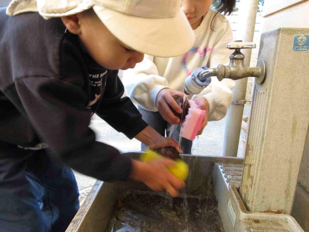 (↑さつまいもを洗っています。)