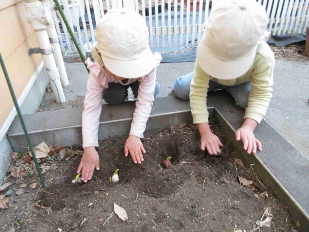 (↑チューリップの球根、植え付け中。)