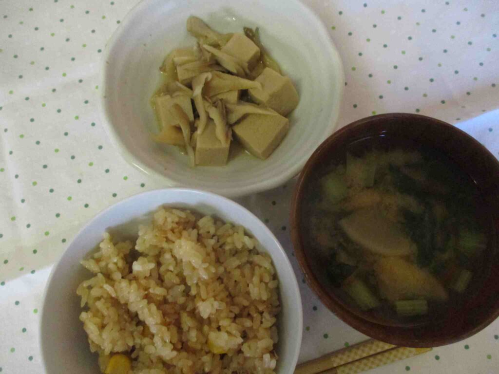 ・コーンとツナの炊き込みごはん ・高野豆腐の煮物 ・大根と小松菜のおみそ汁
