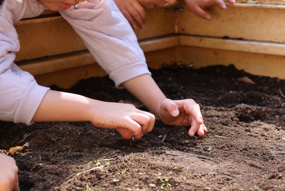 (スナップエンドウの種まき中。4歳児クラス。)
