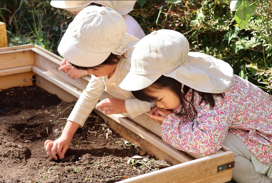 (スナップエンドウの種まき中。4歳児クラス。)
