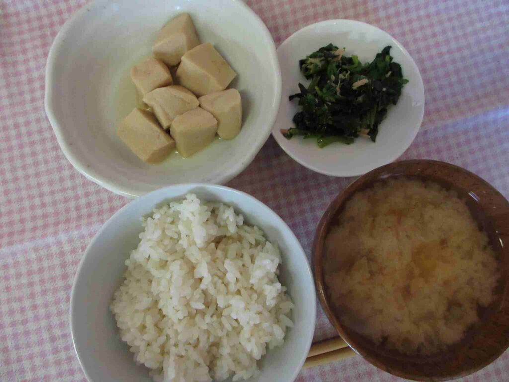 ・五分つきごはん ・高野豆腐の煮物 ・白菜のおみそ汁 ・ほうれん草とにんじん・わかめのツナサラダ風