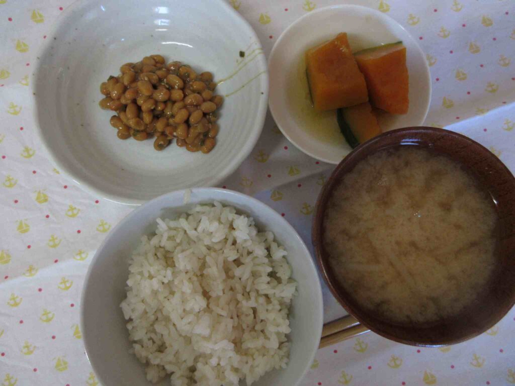 ・麦ごはん ・納豆(のり・白ごま混ぜ) ・もやしのおみそ汁 ・かぼちゃの煮つけ