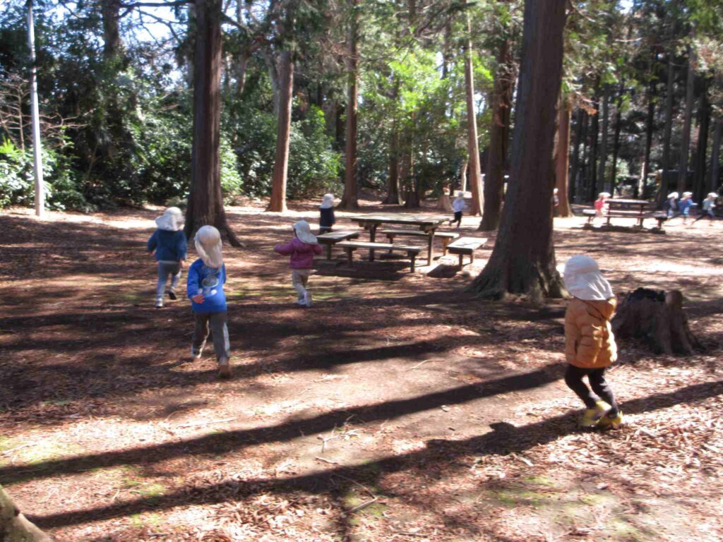 今日のフィールドは、(「かわり鬼」をよくやる)市川市民キャンプ場より広く、障害物(木・ベンチ)もあって、なかなか楽しそうです。